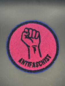 Dieser Antifaschist Patch in leuchtendem Pink, umrandet von Schwarz, setzt ein klares Statement. Das zentrale Motiv einer erhobenen Faust – ein klassisches Symbol für Solidarität und Widerstand – ist schwarz umrandet.