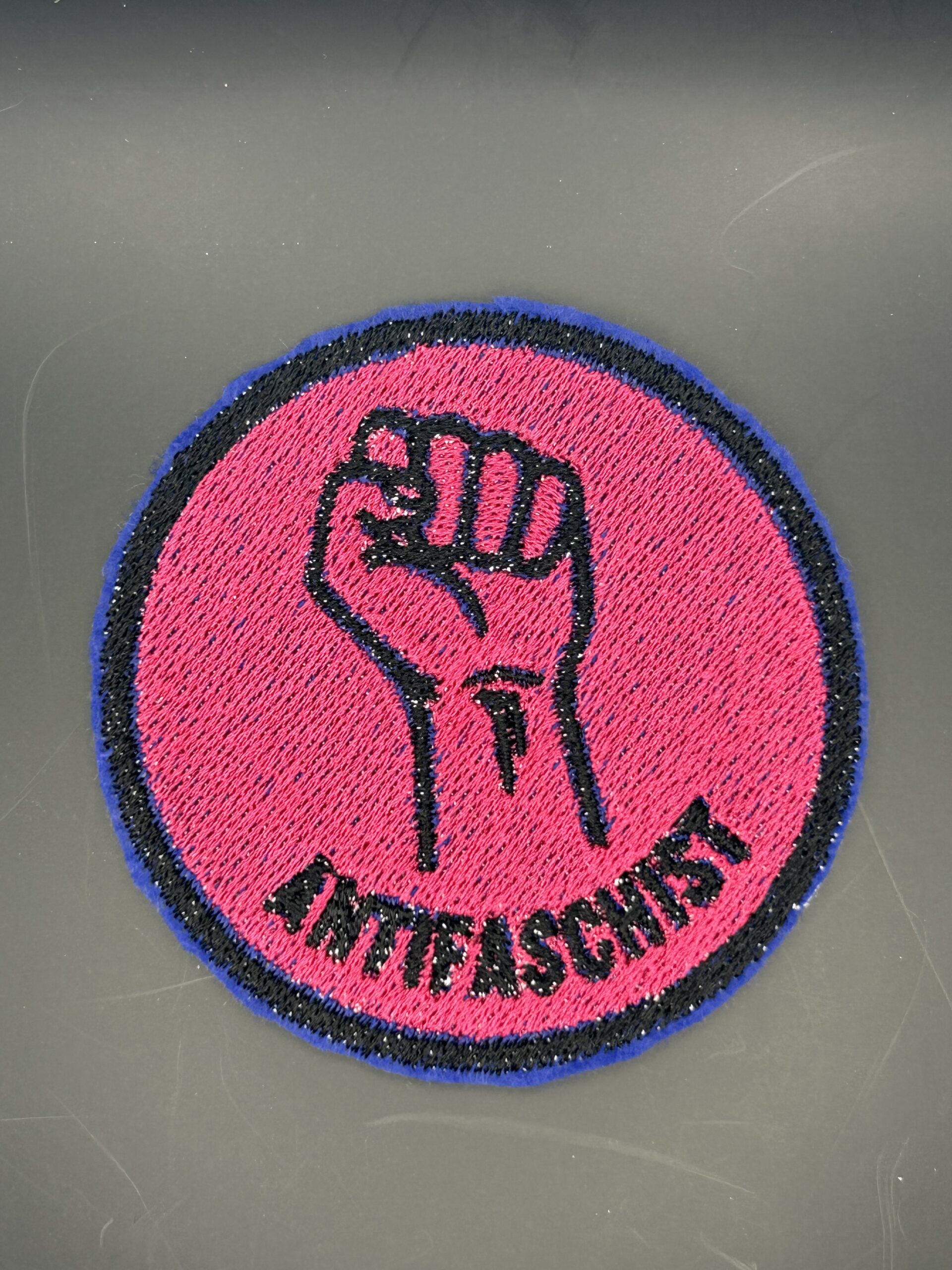 * Design: Runde Form, leuchtendes Pink mit schwarzem Faust-Symbol und Schriftzug „ANTIFASCHIST“.