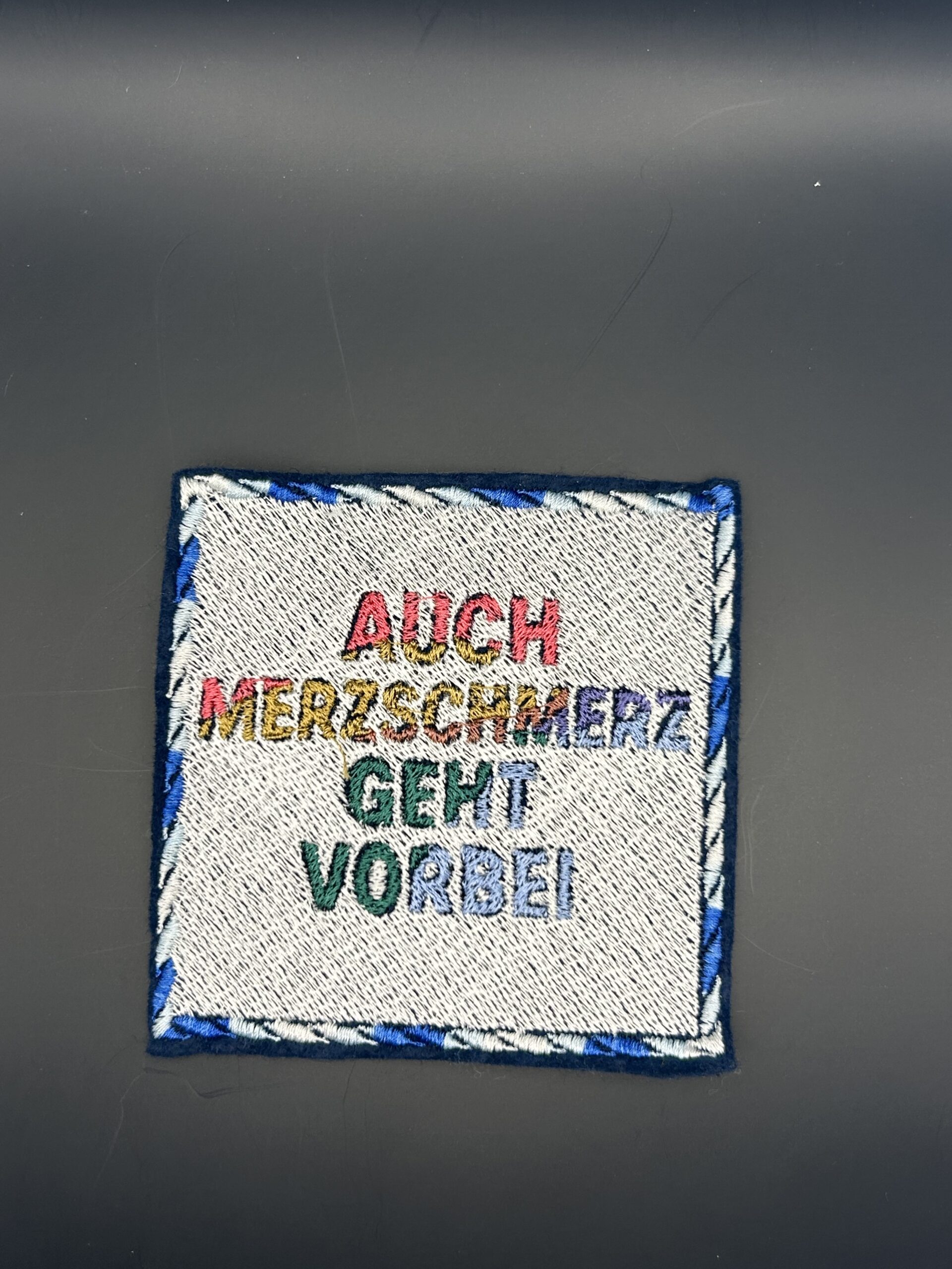 Witzig und politisch zugleich: Der Patch trägt den mehrfarbig gestickten Spruch „Auch Merzschmerz geht vorbei“. Ein originelles Motiv, das besonders auf Jeansjacken oder Stofftaschen gut zur Geltung kommt.