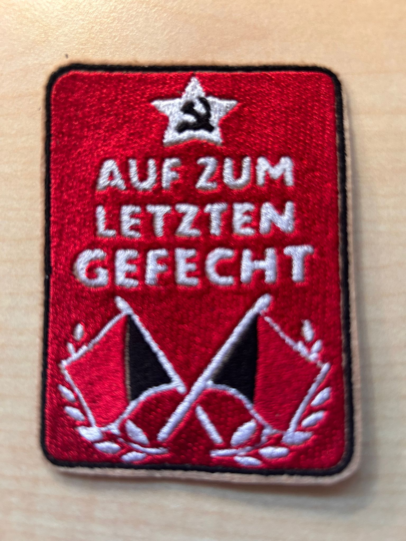 Keine halben Sachen mehr: „Auf zum letzten Gefecht“ auf deiner Jacke sagt alles. Mit gekreuzten Flaggen und Hammer-und-Sichel-Stern bist du bereit für den Umbruch. Retro-Revolution für deinen Style!