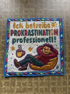 Ein farbenfroher, humorvoller Patch für alle Aufschiebe-Künstler:innen: Der Spruch „Ich betreibe Prokrastination professionell!“ wird begleitet von einer entspannten Figur, einer Kaffeetasse und kleinen Sternchen. Perfekt für Rucksäcke, Laptoptaschen oder Hoodies – und ein ideales Geschenk für Studierende oder Bürohelden.