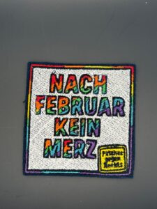 Ein quadratischer Patch mit weißem Hintergrund und bunt gesticktem Schriftzug „Nach Februar kein Merz“. Die regenbogenfarbenen Buchstaben und der farbige Rahmen machen das Motiv zu einem humorvollen, politischen Statement – auffällig, satirisch und perfekt für Jacken oder Taschen.