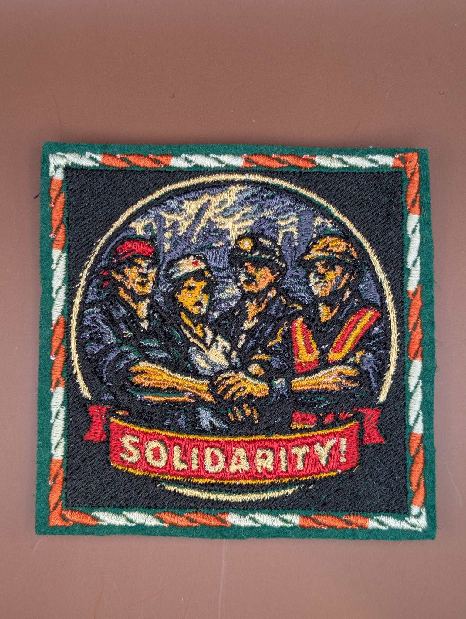 Im Zentrum dieses Patches stehen mehrere Personen, die sich fest an den Händen halten. Die Figuren wirken entschlossen und geeint, eingerahmt von dunklen Farben, die Ernsthaftigkeit und Widerstand symbolisieren. Das rote Banner mit der Aufschrift „SOLIDARITY!“ hebt die Kernbotschaft hervor: Stärke entsteht durch Gemeinschaft. Der Patch steht für Zusammenhalt, gegenseitige Unterstützung und kollektiven Widerstand